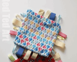 Taggie blankets (or tag blankets) are small sensory blankets with ribbon loops around the edges that babies love to grab and explore. These beginner sewing projects involve cutting two squares of fabric, sandwiching folded ribbon loops between the layers, and sewing around the perimeter. You can find crinkle paper here. They’re quick, cute, and make perfect baby shower gifts!